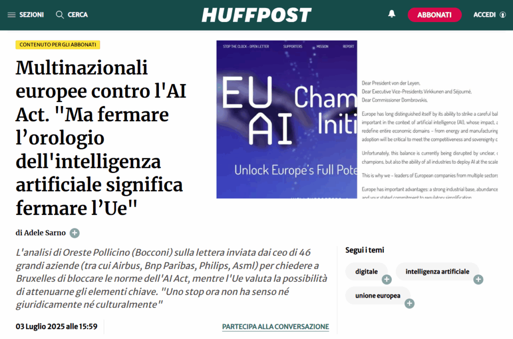 Multinazionali europee contro l’AI Act. “Ma fermare l’orologio dell’intelligenza artificiale significa fermare l’Ue”, di Adele Sarno, huffingtonpost.it, 03 Luglio 2025