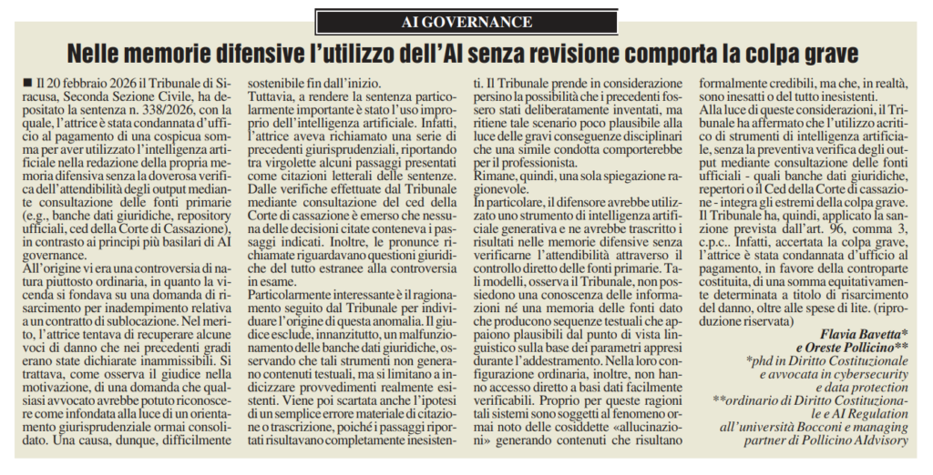 Il nuovo articolo di Oreste Pollicino e Flavia Bavetta all’interno della rubrica “AI Governance” per Milano Finanza
