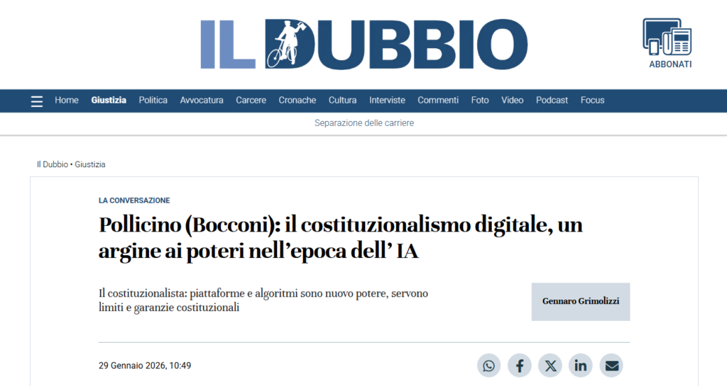 Costituzionalismo digitale, nuovo argine ai poteri nell’epoca dell’IA, con O. Pollicino, Il Dubbio, 28 Gennaio 2026