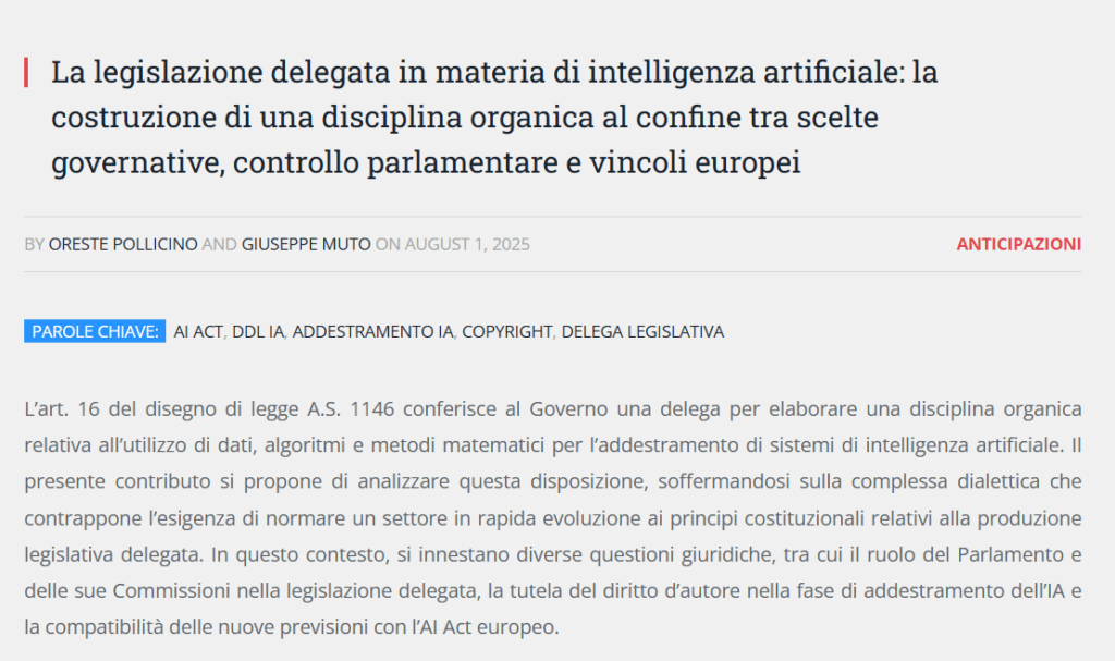 È disponibile in libreria e online il volume “AI e Sostenibilità. Verso una compliance integrata”, edito da Giappichelli e curato dal Prof. Oreste Pollicino. Il libro esplora in profondità il rapporto tra sviluppo dell’intelligenza artificiale e sostenibilità – giuridica, sociale, ambientale – proponendo un modello di compliance integrata capace di coniugare innovazione tecnologica, tutela dei diritti fondamentali e responsabilità d’impresa. Tra i temi affrontati: Valutazione d’impatto e governance dell’IA Risk-based approach e responsabilità algoritmica AI Act e strategie ESG Diritto europeo e nuovi modelli di regolazione sostenibile Un’opera di riferimento per aziende, policy maker, giuristi e studiosi che operano all’intersezione tra tecnologia, diritto e sostenibilità.
