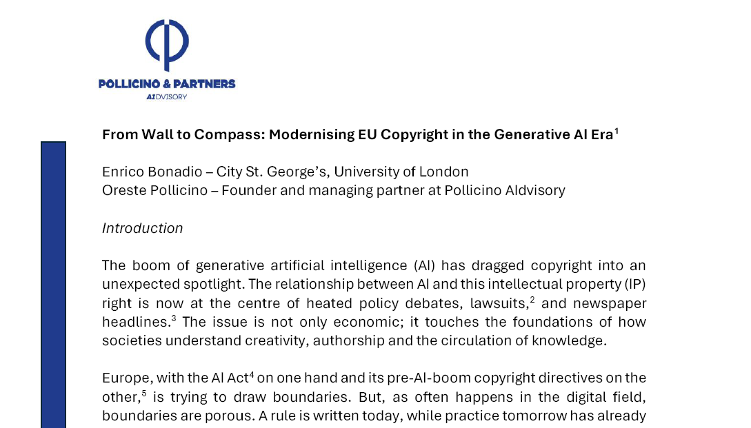 Un’analisi di Bonadio e Pollicino sul futuro del diritto d’autore nell’era dell’IA generativa: dal copyright come “muro” al copyright come “bussola”, per bilanciare innovazione, trasparenza e tutela dei creatori.