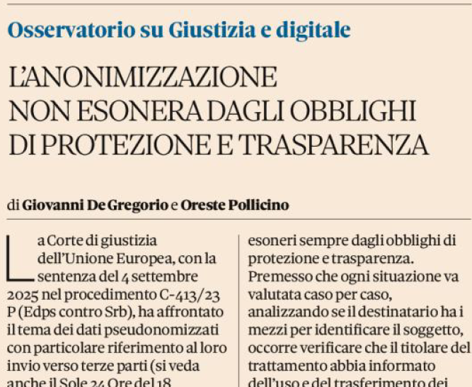 La Corte di giustizia dell’Unione Europea, con la sentenza del 4 settembre 2025 nel procedimento C-413/23 P (Edps contro Srb), ha affrontato il tema dei dati pseudonomizzati con particolare riferimento al loro invio verso terze parti (si veda anche il Sole 24 Ore del 18 settembre). La vicenda trae origine da una decisione adottata il 7 giugno 2017 dal Single resolution board (Srb), l’autorità incaricata della risoluzione delle crisi bancarie nell’Unione.